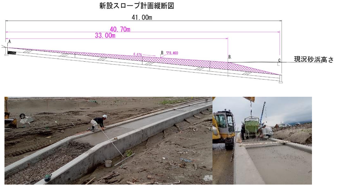 既存のスロープが斜度9.8%、自力で車いす乗降可能な斜度6.7%にするための勾配調整施工工事で、距離は既存スロープのおよそ2倍の約41mとなっています。また、スロープは使用済み自動車の窓ガラス約1.6t(約200台分)を混入したコンクリートで施工。