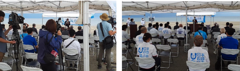 小谷代表は挨拶で「車いすのみならず、ベビーカーやご年配の方の歩行器等でも簡単に乗降通行でき、潮風を満喫できるスロープあるバリアフリービーチ西浜海水浴場を県内外に発信したい」と述べた。また、来賓の皆様から祝辞をいただき、日本財団常務理事の海野光行様からは式典に寄せていただいたメッセージが披露された。マスコミ取材も新聞社2社、テレビ民放4社、話題性の高さを示した事業であった。