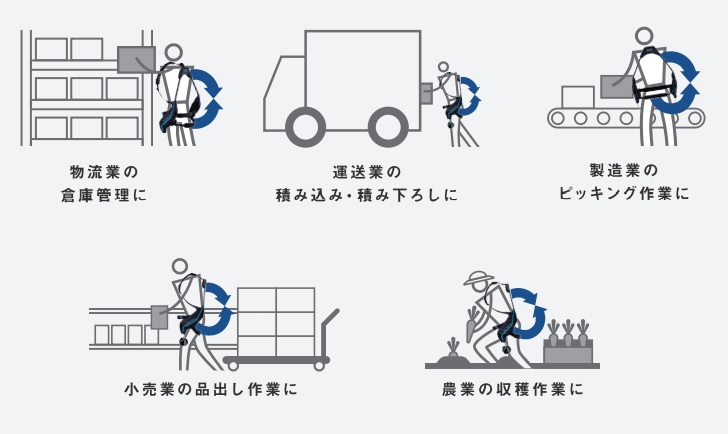 歩く・しゃがむ・立ち上がる動作をより自由にし、腰への負担を軽減する『マッスルスーツ GS-BACK®(バック)』は、さまざまな現場の作業でお使いいただけます。