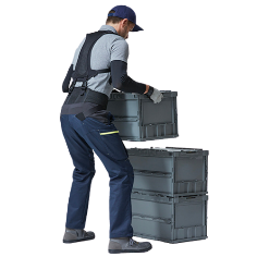 中腰姿勢を保つ、人や重い物を持ち上げるなどの作業時に腰の負担を低減するアシストスーツ。最大27kgfの補助⼒、重量は4.3kgと軽量。電力を使用せず、圧縮空気を使用した人工筋肉が補助力を発揮するため、製造・農業・介護・物流・建設などの作業現場にご利用いただけます。2021年4月末現在、マッスルスーツ®はシリーズ累計出荷台数20,000台を突破。人工筋肉を使用した外骨格型アシストスーツでは世界一(※当社調べ)の出荷台数を誇ります。