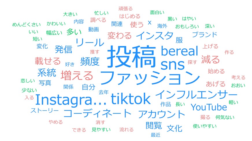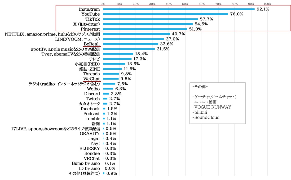 Top3は「Instagram」(92.1%)「YouTube」(76.0%)「TikTok」(57.7%)で、「Pinterest」も5割を超えました。“盛れないSNS”の 「BeReal.」は大幅増(昨年調査+13.2%)。中国のSNS「小紅書/RED」(同+7.1%)や「WeChat」(同+5.5%)も増加しており、中国デザイナー・インフルエンサー好きの学生や、留学生が利用しているようです。