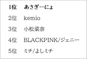 「kemio」 「BLACKPINK/ジェニー」も上位に。動画とK-POPアイドルの影響力がくっきり。