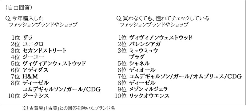 「今年購入したファッションブランドやショップ」「買わなくても、憧れてチェックしているファッションブランドやショップ」を自由回答で聞きました。