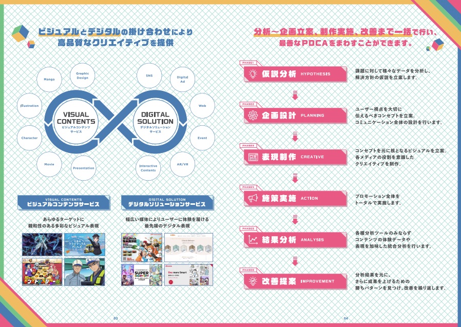 企業が抱える課題をビジュアルとデジタルの力で解決するプロモーションの提案を企画~実制作、運用改善まで行っており、総合的な意味で「デジタルクリエイティブカンパニー」となっています。